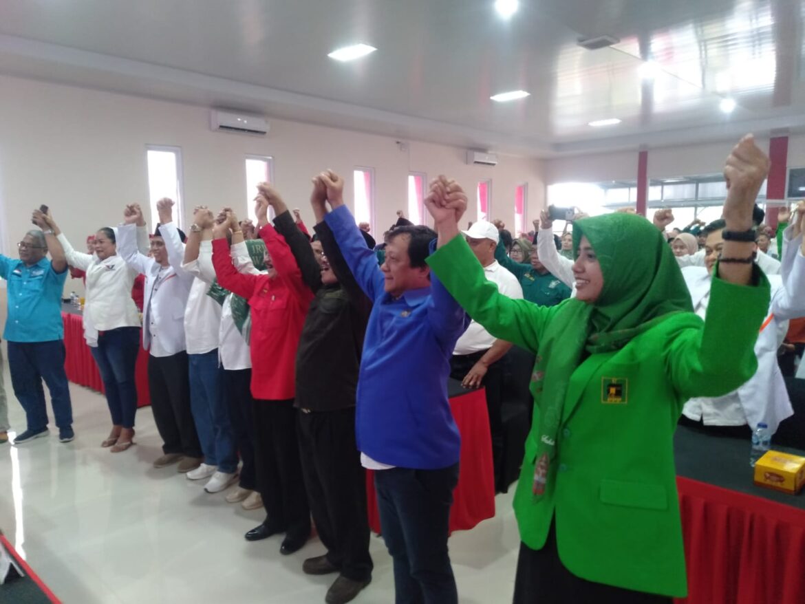 PURWOKERTO-Deklarasi Bakal Calon Bupati-Wakil Bupati Banyumas, Sadewo Tri Lastiono-Dwi Asih Lintarti, berlangsung semarak. Pasalnya, acara yang berlangsung di Kantor DPC PDI-P Banyumas, Selasa 27 Agustus 2024 itu dihadiri massa dari 8 partai pengusung.
