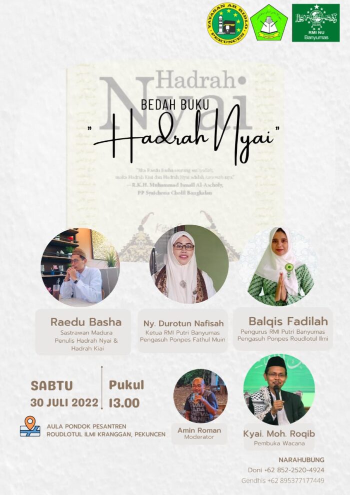 PEKUNCEN-Buku kumpulan puisi ‘Hadarh Nyai’ yang ditulis penyair Madura, Raedu Basha, Sabtu 30 Juli 2022, dibedah di PP Roudlatul Ilmi, Kranggan, Pekuncen,Banyumas. Acara yang digelar oleh Robithoh Ma’ahid Islamiyah ( RMI) Putri Banyumas itu, dihadiri puluhan nyai dan santriwati Banyumas.