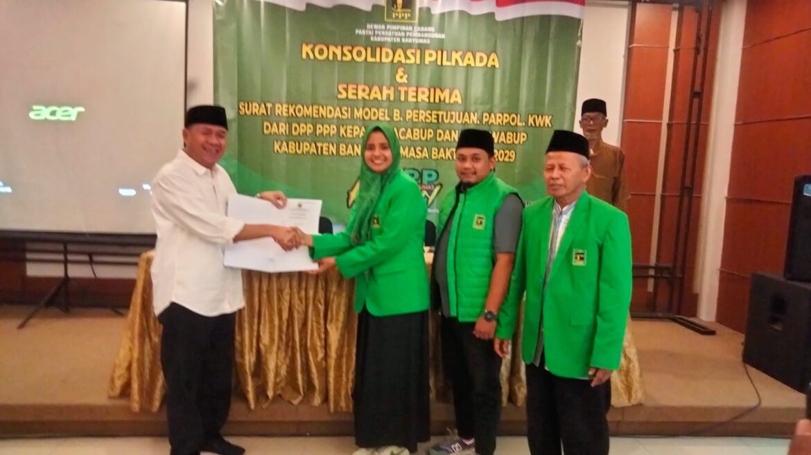 PURWOKERTO-Partai Persatuan Pembangunan (PPP) mendukung Bakal Calon Bupati (Bacalon) Banyumas, Sadewo Tri Lastiono. Keputusan mendukung Sadewo itu seteah DPC PPP Banyumas melakukan kajian dan pembahasan yang selanjutnya didiskusikan di DPW dan DPP PPP. Surat rekomendasi dukungan diserahkan oleh Ketua DPC PPP Banyumas Balqis Fadillah, dan diterima oleh Sadewo. Surat rekomendasi model B persetujuan Parpol KWK dari DPP PPP kepada Bacabup dan Bacawabup, dilaksanakan pada Jumat (23/08/2024).