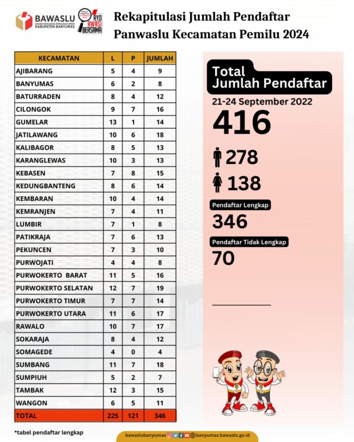 PURWOKERTO-Jumlah pendaftar Panitia Pengawas Pemilu (Panwaslu) kecamatan di Banyumas pada hari ke empat terus bertambah. Hasil pantauan tim Humas Bawaslu Kabupaten Banyumas sampai dengan hari Sabtu (24/9/2022) tercatat jumlah pendaftar total sudah mencapai 416 orang yang terdiri dari 278 orang laki laki dan 138 orang perempuan.
